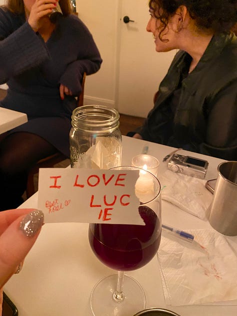 i’ve never thought of myself as a “natural” gatherer. i’ve always been more of a devoted attendee / captain of the vibes committee type. i thought i didn’t like hosting, but it turns out what i actually don’t like is LOGISTICS. i don’t like figuring out where to go, how to divide up groups, how much time to spend on each question, enforcing the run of show, etc. all of that task-related work is very unappealing to me. but the more creative work — what we should talk about, how a party should feel, what makes for the best combination of people, what the goal of the night is — that’s very enjoyable to me. and hosting is a delicate balance between the two! as i am learning.