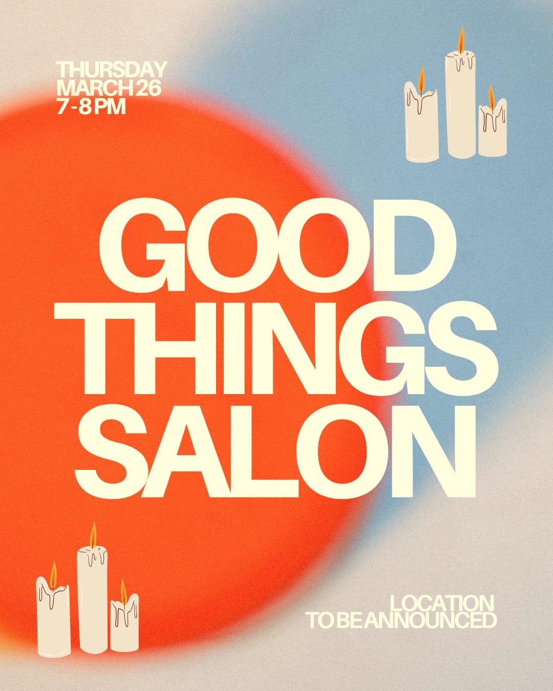 The reason I started this newsletter was to push against hopelessness by curating a list of good stuff that makes me feel like life is worth living. It began as a practice to get me out of my own head, which can sometimes be a very pessimistic place, and to write about stuff I like and why I like it. But by far the thing that keeps me writing each week is the connection it brings me to the people who read it. When friends, family, or strangers reach out to discuss a piece that was in good things or commiserate over something that was in bad things, I feel like I am momentarily at that candlelit table at the back of the bar. Toward the end of last year, I was thinking about the kind of place I wanted to meet new friends or potential suitors and I kept coming back to the idea of that table. GOOD THINGS SALON will bring this sacred exchange I’ve had into the real world and be a place for discussion and fun and hopefulness.